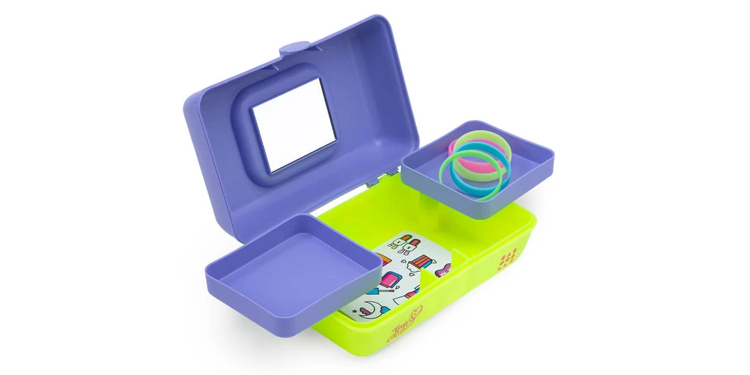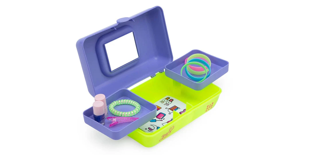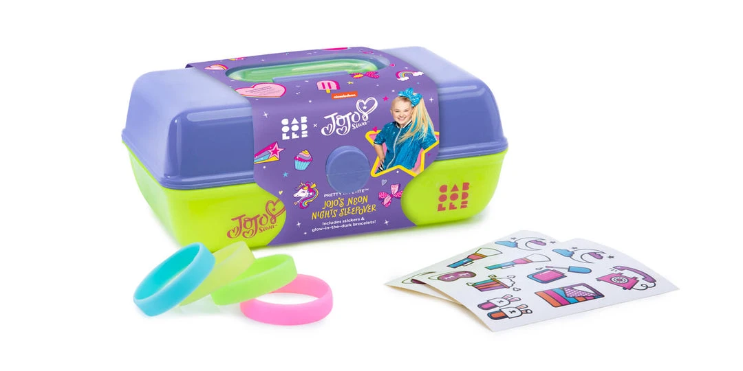 This compact carrying case is the perfect size for an overnighter with JoJo Siwa™ and your best friends. It contains two swivel trays, a fashion mirror, stickers, and glow bracelets for a memorable and organized sleepover.