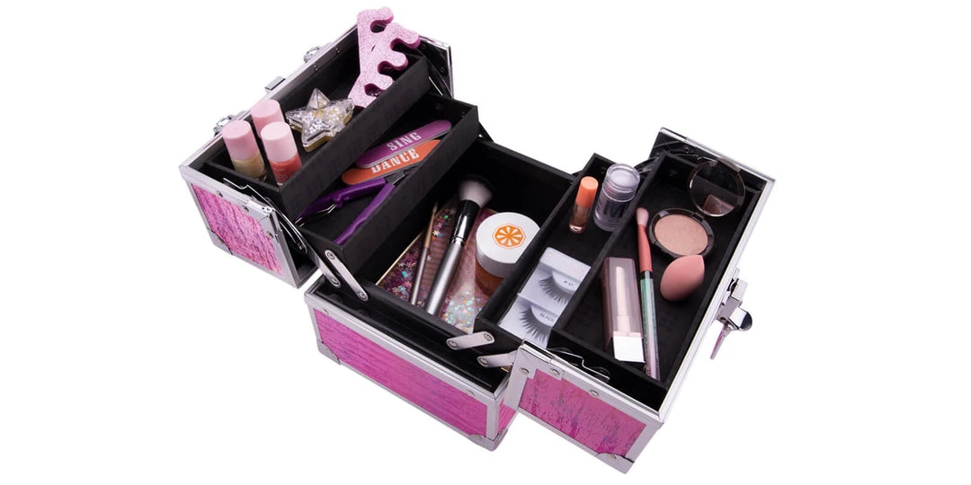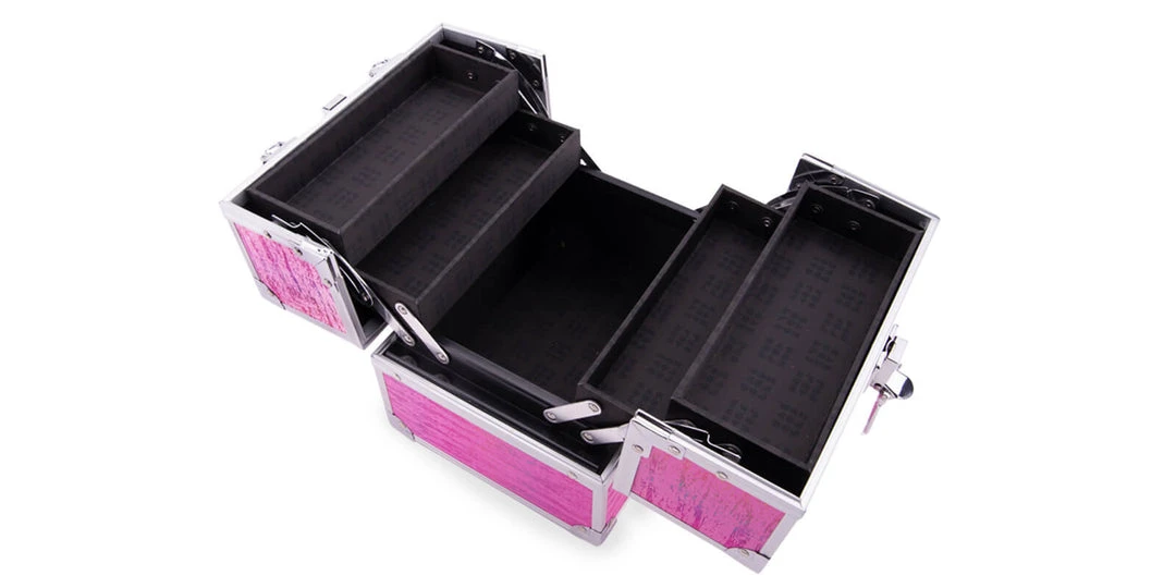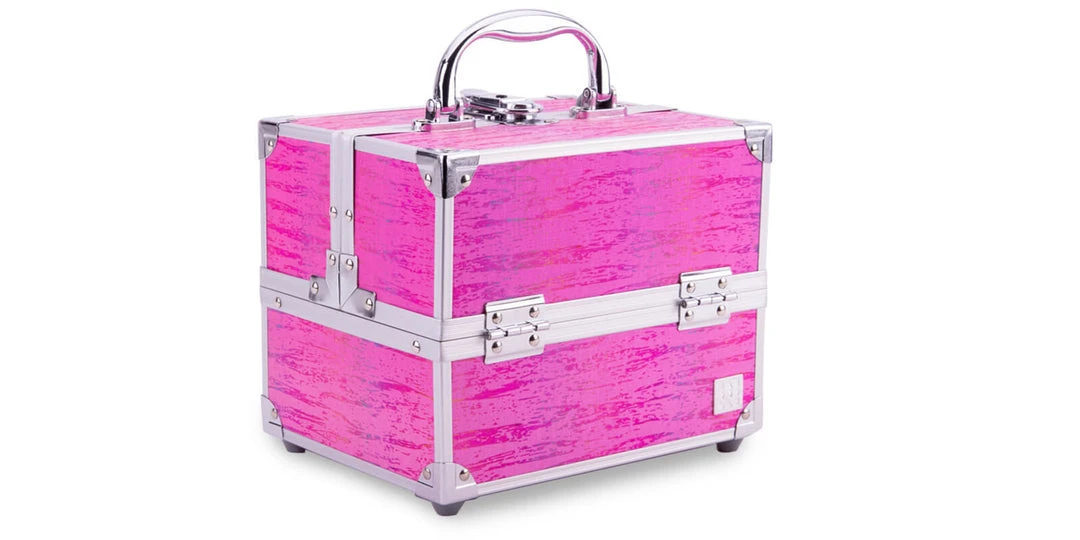 Beautifully brave and uniquely you, the Adored™ Train Case features 4 auto-open trays, spacious interior storage, and a locking latch with keys, making it fashionably fun and FUNctionally fabulous.