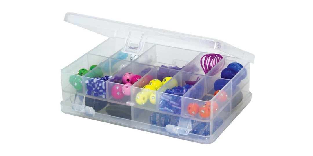 Double the storage power, double the storage possibilities! The Double-Sided Micro Utility features 14 small compartments perfect for all those hard-to-store items. Beads, baking supplies, nuts, bolts and more – little things can make big impressions! This craft box is small but mighty!